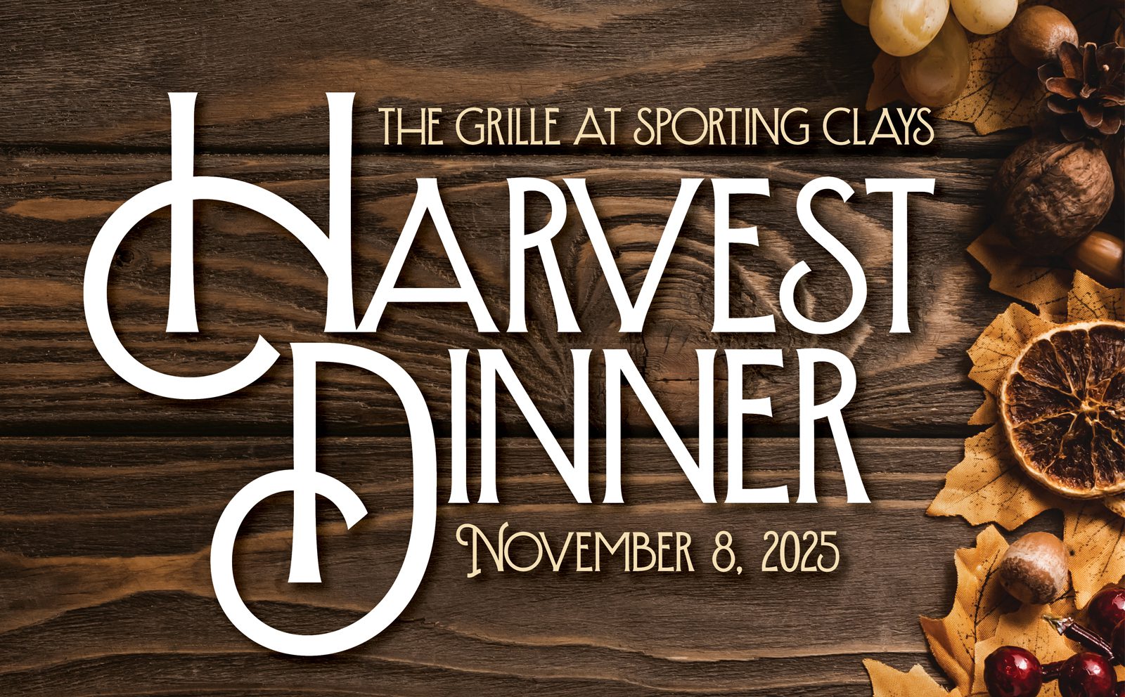 Celebrate the bounty of Autumn and join us at The Grille at Sporting Clays for the Harvest Dinner, Saturday, November 8, 2025.